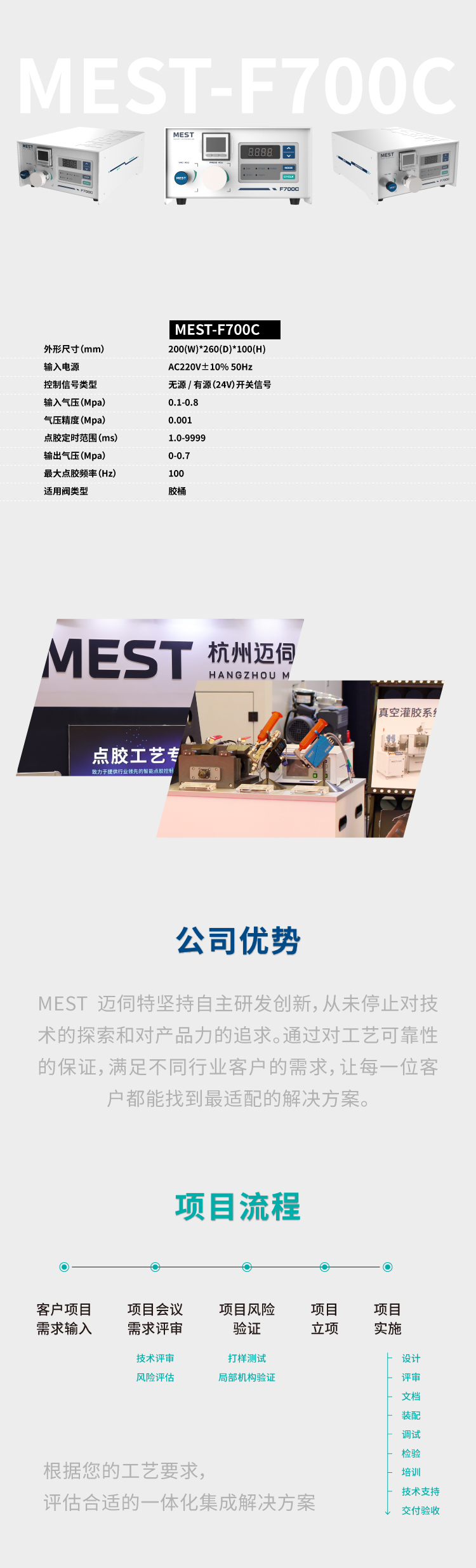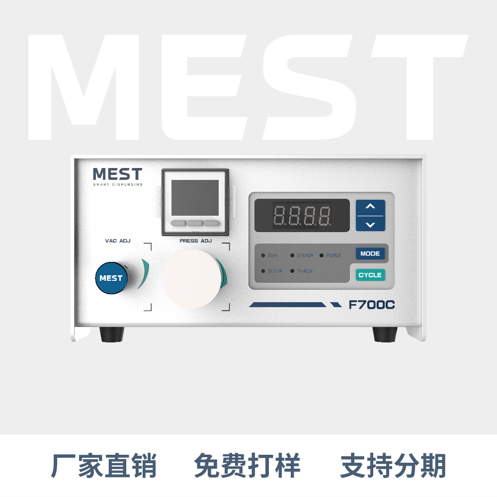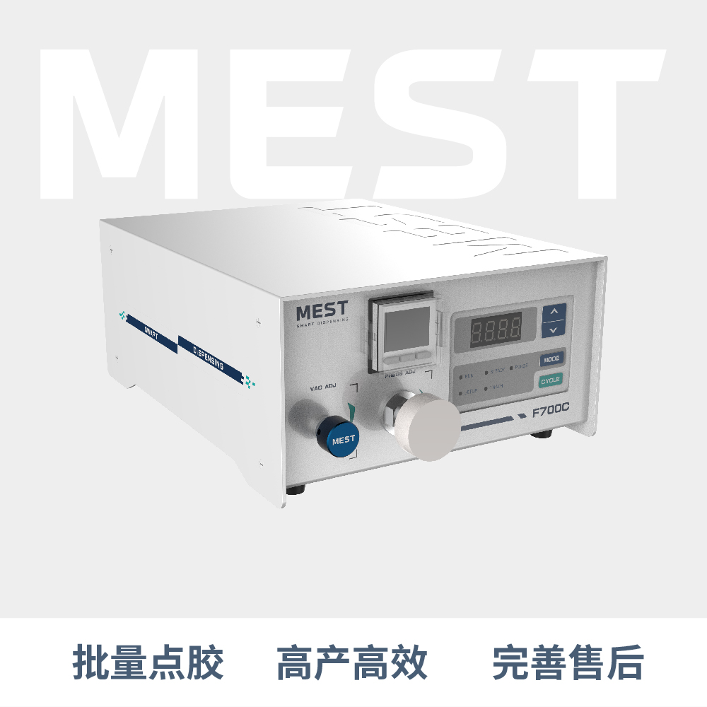 MEST-F700C 高速点胶控制器可控制胶筒进行点胶,具备真 空回吸功能,输入气压 0.1-0.8Mpa,气压精度可达 0.001Mpa,点胶设时 范围 1.0-9999ms。